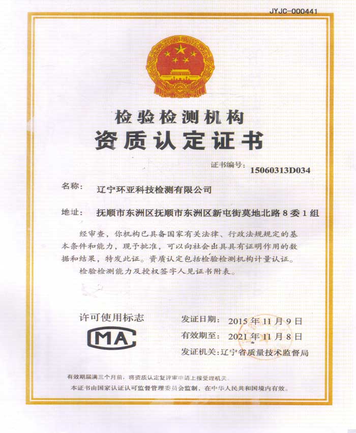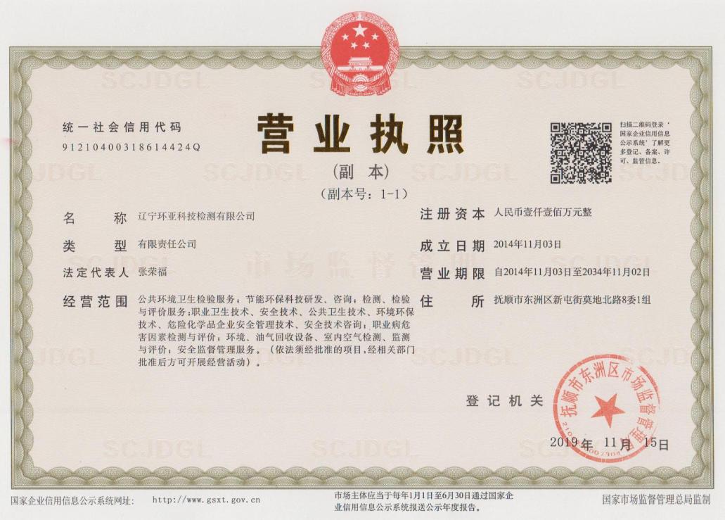 遼寧環(huán)亞科技檢測有限公司秉承“公平、公正、客觀、真實”的服務理念,力求為遼寧省各企事業(yè)等用人單位提供更優(yōu)質(zhì)的服務,公司領導率領全體員工歷時一年零八個月的時間操練各項基本技能,于2016年8月9日取得了(遼)安職技字(2016)第B-0019號《職業(yè)衛(wèi)生技術服務機構(gòu)資質(zhì)證書》
